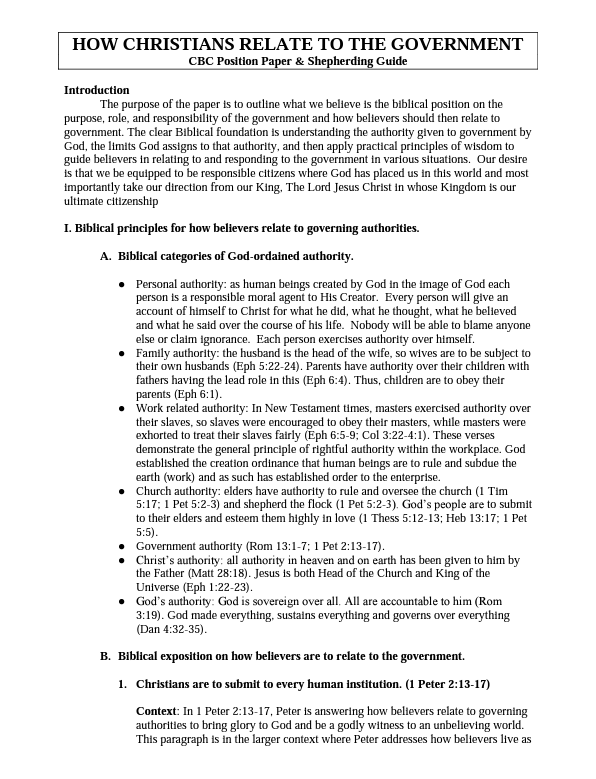 The purpose of the paper is to outline what we believe is the biblical position on the purpose, role, and responsibility of the government and how believers should then relate to government. The clear Biblical foundation is understanding the authority given to government by God, the limits God assigns to that authority, and then apply practical principles of wisdom to guide believers in relating to and responding to the government in various situations. Our desire is that we be equipped to be responsible citizens where God has placed us in this world and most importantly take our direction from our King, The Lord Jesus Christ in whose Kingdom is our ultimate citizenship.